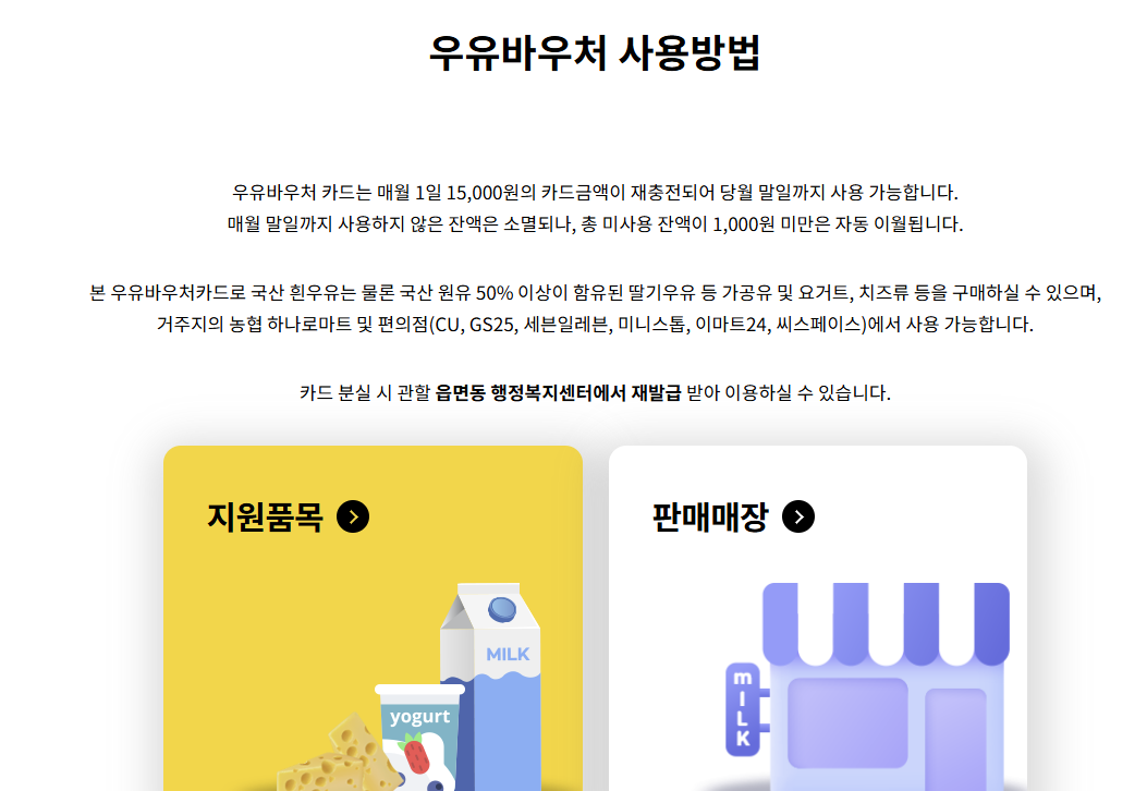 구매 가능 품목에는 국산 흰우유, 가공유, 요거트, 치즈류 등이 포함되며, 카페인이 함유된 커피 우유나 탄산이 포함된 유제품 등은 대상에서 제외됩니다. 바우처는 지정된 가맹점에서만 사용할 수 있고, 대부분의 지역 농협 하나로마트와 전국 주요 편의점에서 결제가 가능합니다.