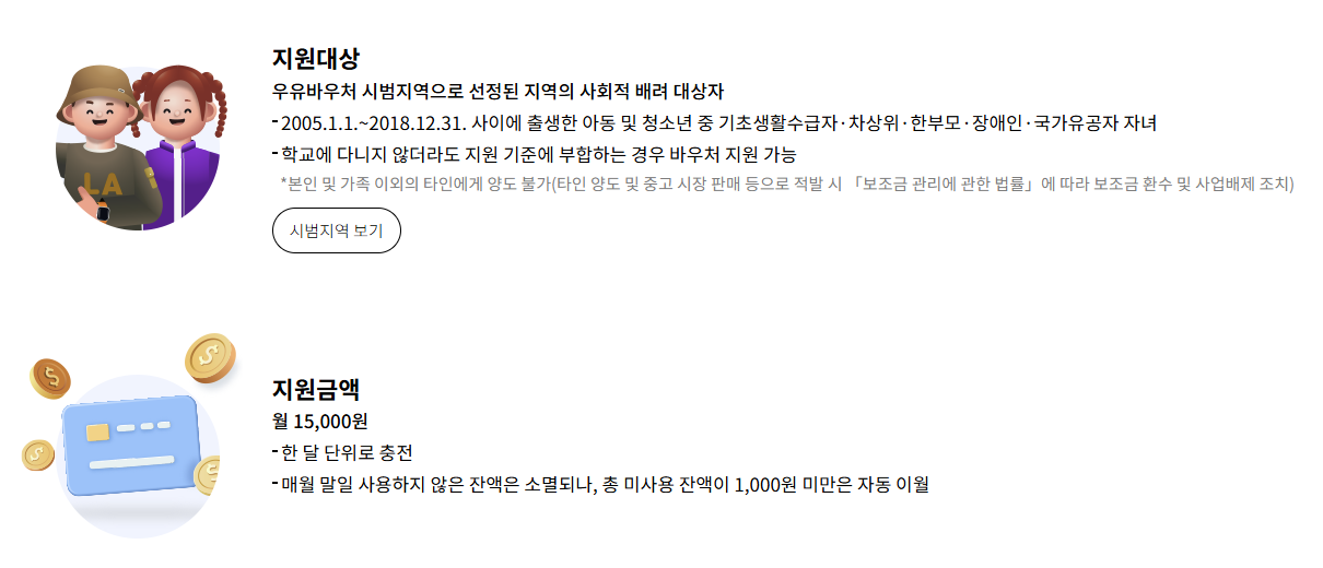 또한, 바우처는 본인 또는 보호자만 사용할 수 있으며, 타인에게 양도하거나 중고 거래로 판매할 경우 부정 수급으로 간주되어 카드 회수 및 향후 사업 참여가 제한될 수 있습니다. 바우처는 지원 목적에 맞게 정확히 사용하는 것이 중요합니다.