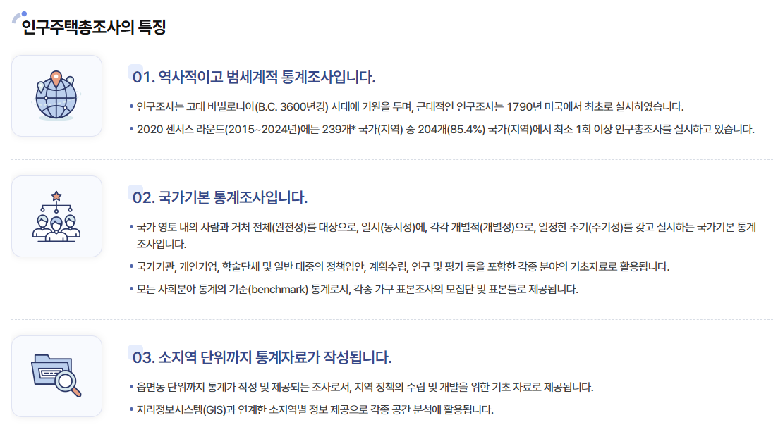 | 주요 목적 | 인구·주택 구조 파악, 정책 수립 근거 제공 |
